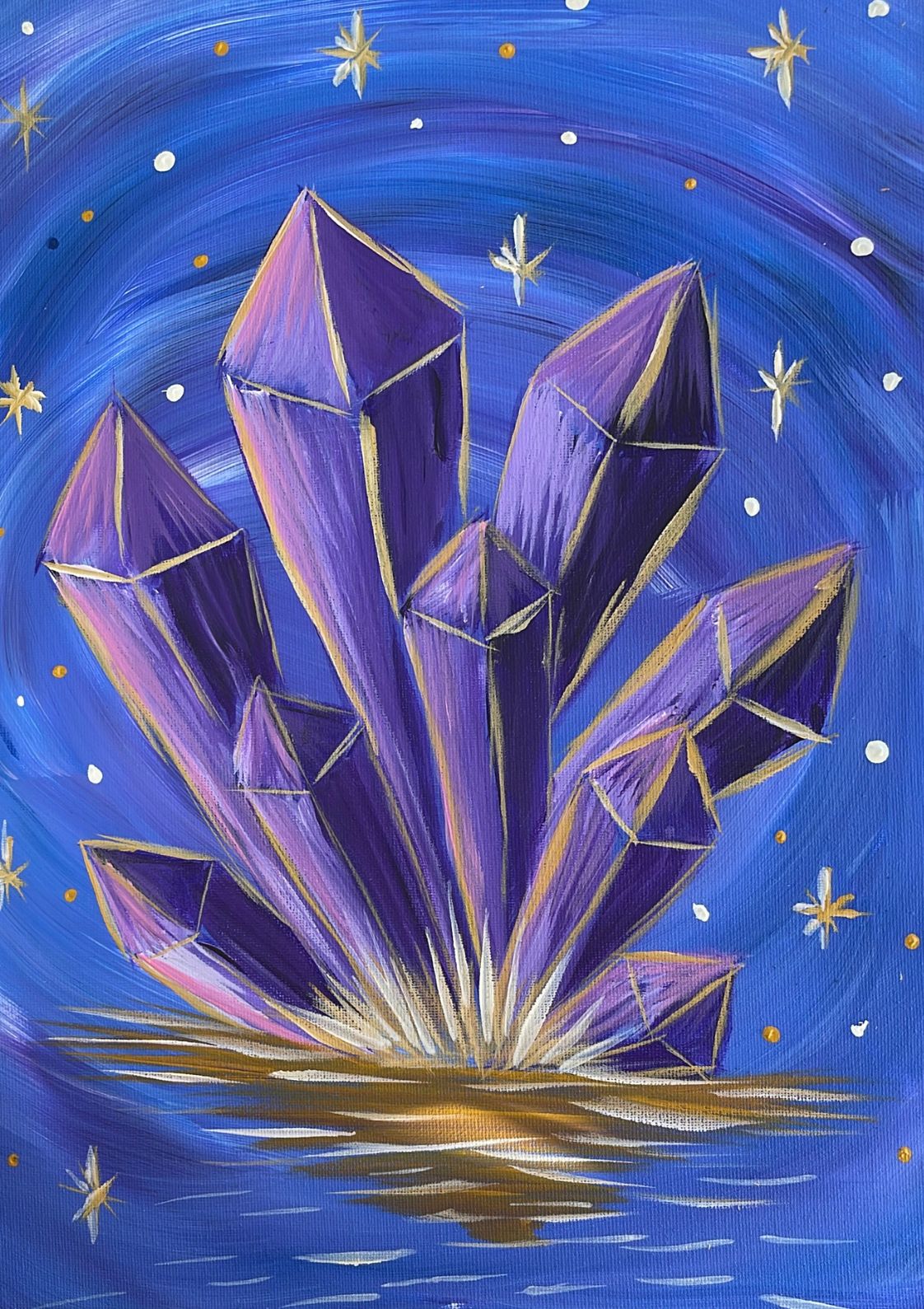 This isn’t just a painting class; it’s a journey through the universe. Under the guidance of our talented hosts, you’ll create a stunning crystal artwork, swirling with deep blues, purples, and shimmering starbursts.